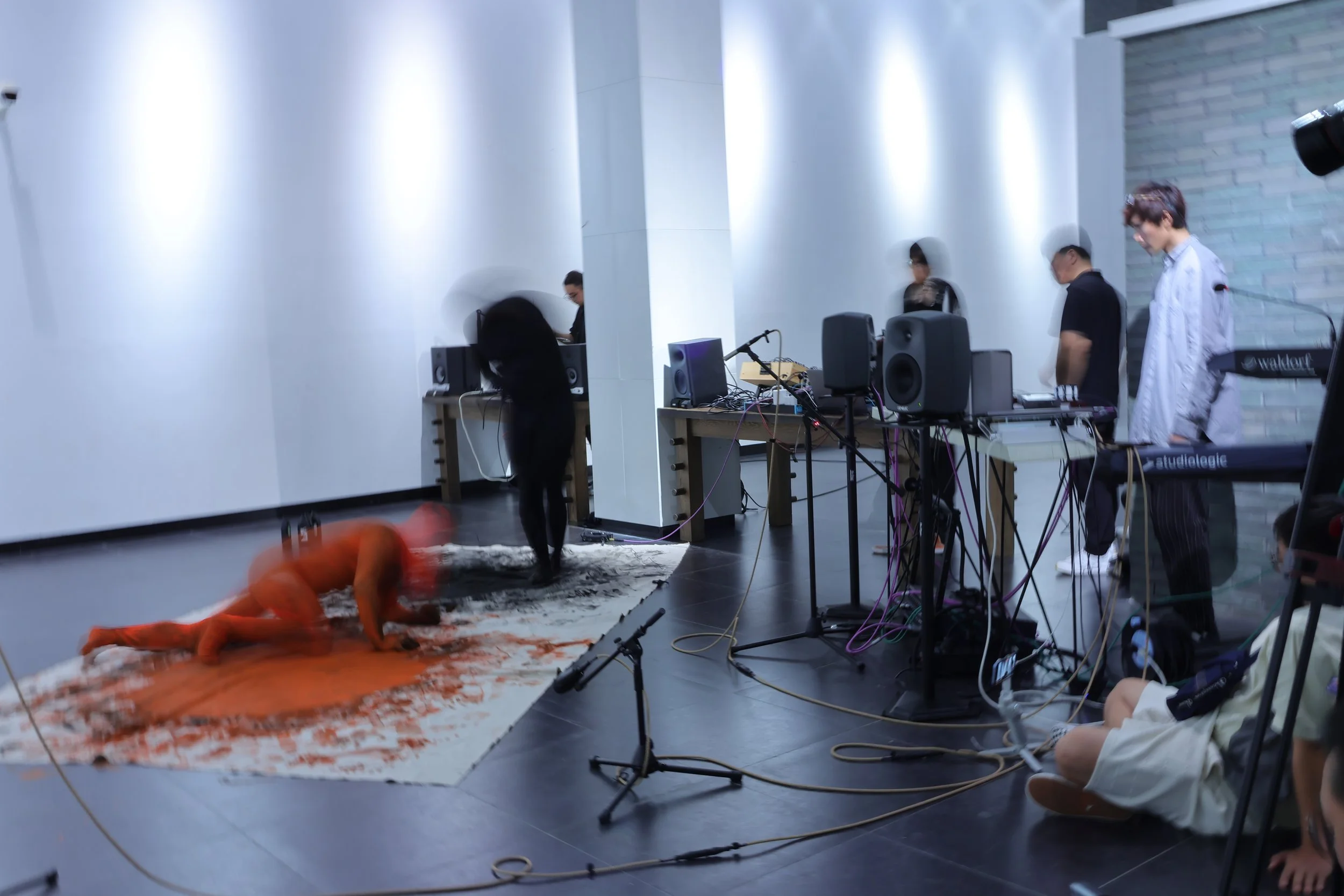在这场表演中,苍鑫与煜恒试图剥除身体的主观性,将其转化为纯粹且未经人为干预的物质形态。身体作为媒介,成为引导痛苦、挣扎、暴力与窒息的通道,通过声音与墨迹加以表现。这场表演使用了由 Haar、Thomas Gao 和 Acrow 设计的互动声音装置,将煜恒与苍鑫的实时脑电波和心跳转化为声音,并通过放大这些信号,创造出一个源自他们身体的声音景观。表演将他们的身体化为沉浸式的风景,旨在对观众产生强烈的情感和感官冲击。这不仅是“展现而非言说”的声明,更是对身体与精神最纯粹形式同步性的直接呈现。