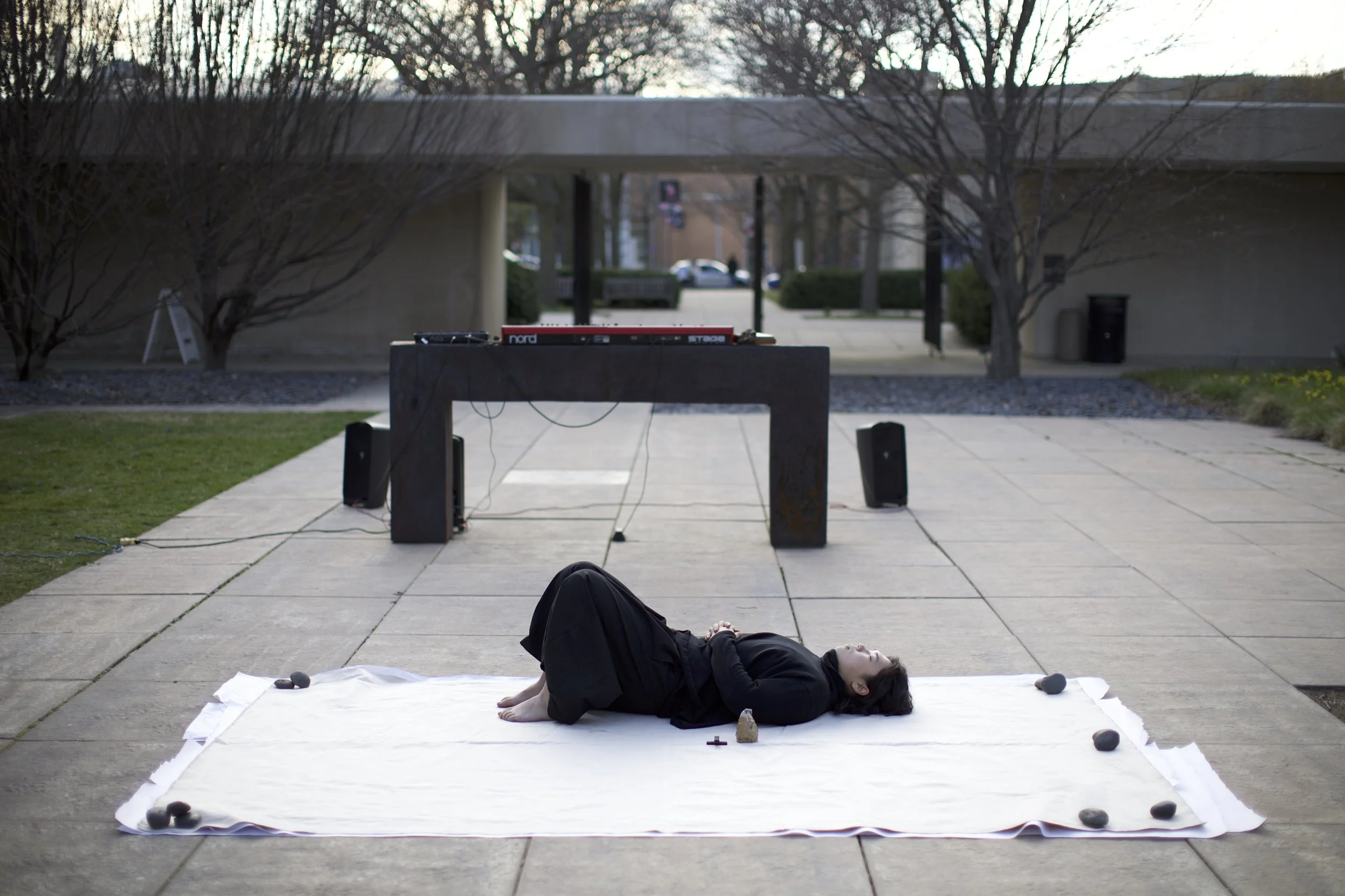 As a painter, I aspire to create art that is brimming with life. Life emerges from chaos, and its formation is irrational and unpredictable. To me, the beauty of nature and life is an embodied experience that transcends language. This experience is multidimensional, engaging our senses and spatial awareness in ways that are difficult to articulate. Therefore, I view painting not only as a visual medium but also as a tactile and auditory experience. In this creation, I collaborated with musician Ben Kinsinger for an improvisational duet of painting and music. We used stones and branches sourced from the environment to create music and painting in the air and on canvas, as well as in the natural environment of the Smart Museum courtyard, constructing a multidimensional sensory space. Music is painting, and painting is music; together, we cultivate an organic ecology from scratch in nature. This organic nature is reflected in the irreproducibility, unpredictability, and momentary essence of this performance.